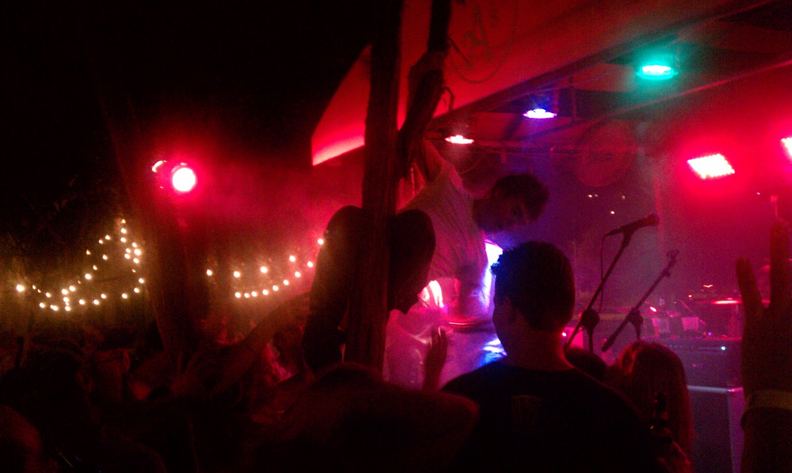Red Eyed Fly ( http://www.redeyedfly.com/home.html ) from the outside seems a little unassuming. It looks really small, but goes to prove that looks can be deceiving. With room inside for a pool table, a lounge by the entrance, stage in the back corner and a long bar on the side there is plenty of room here to check out a band and still have a conversation. Outback....HOLY SHIT! This place has got a GREAT area off of Waller Creek with a stage in the far back and a very decent side area for the crowd to watch shows.